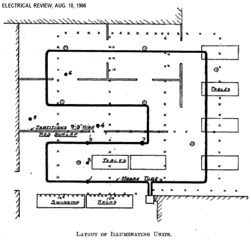 | Plan d’implantation du 1er tube de Moore installé dans la droguerie Bamberger à Newark, New Jersey - 1904 |